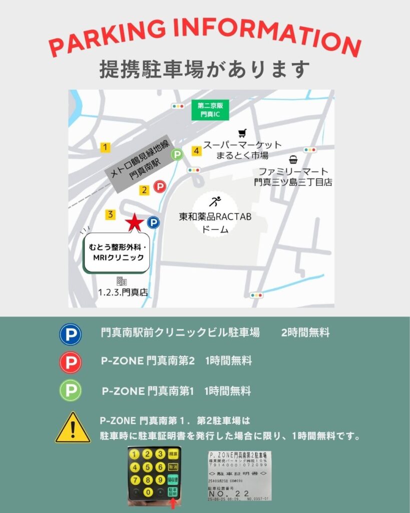 2025.10.4 Sat. 提携駐車場の拡大につきまして P-ZONE 門真南第1,P-ZONE 門真南第2駐車場が、提携駐車場に追加となりました。駐車証明書をお持ちになりご来院ください。ご迷惑をおかけし申し訳ありません。